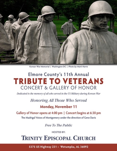 Trinity Episcopal Church of Wetumpka is hosting the 11th Annual Elmore County Tribute to Veterans, featuring a Concert and Gallery of Honor.