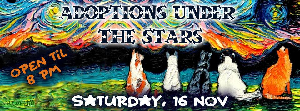 We sure hope you can stop by our Shelter this coming Saturday, 16 November, for our 4th Annual Adoptions Under the Stars! What is that you say? We will open at our normal 9 a.m. for adoptions but then we will be staying open for adoptions until 8 p.m.! And for approved adopters we will also have a board whereby they can uncover a potential free or reduced fee adoption or a special prize. And even if you are not looking to adopt right now, please stop by to check out our Shelter after dark as our staff will be decorating all week in preparation and would love to show off their work!