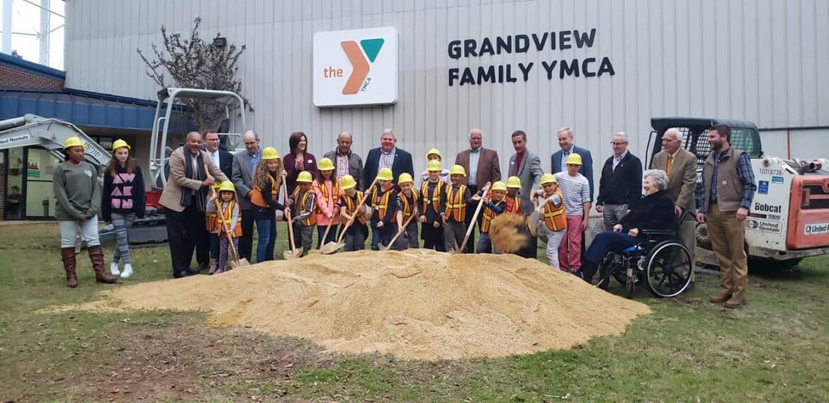 YMCA and Community supporters Jim and Elmore Inscoe, Mayor Kelley, Economic Development Director Ann Harper, Commissioner Bart Mercer, Sen. Chambliss, Sr. Vice President Jeff Reynolds, Grandview Board Chair Andrew Harp, Tom and Bessie Parker, and Bill Myers were just some of those included in the official groundbreaking. A group of young children from the YMCA also offered their assistance.