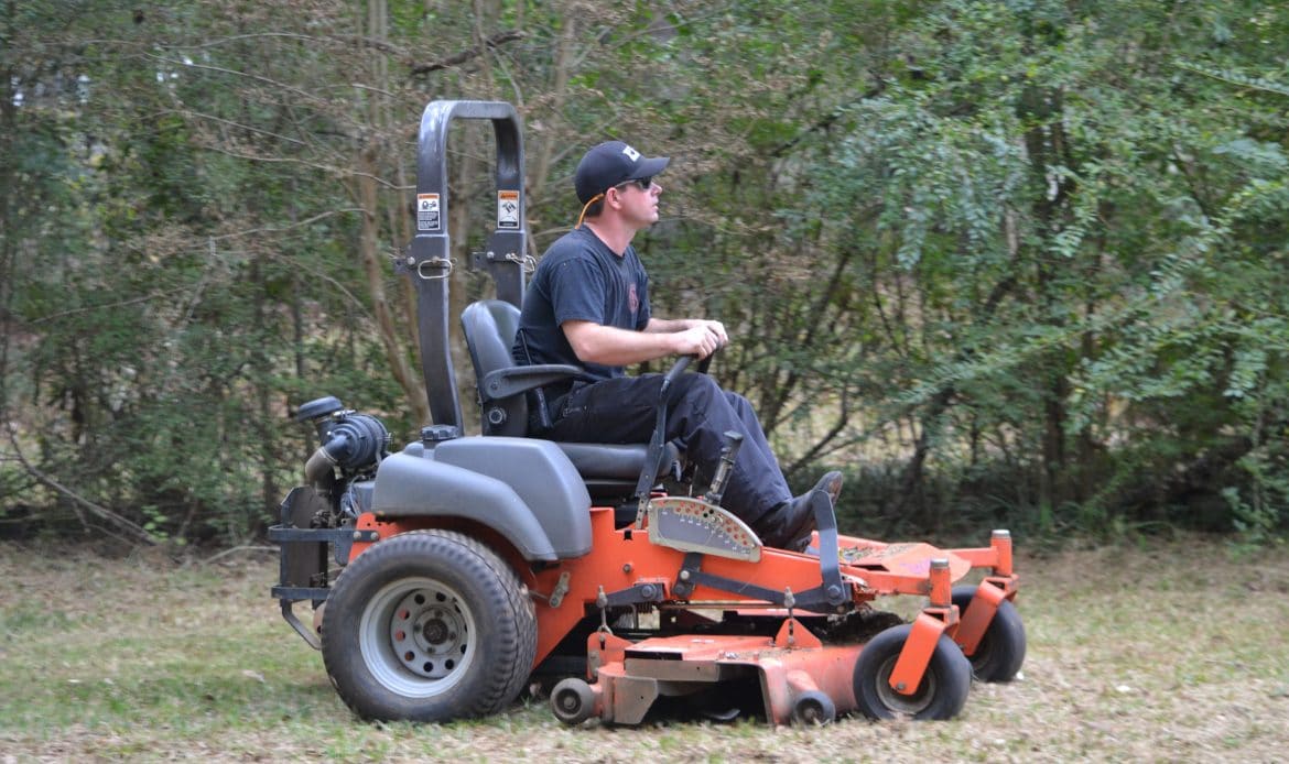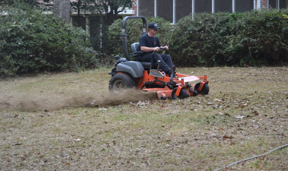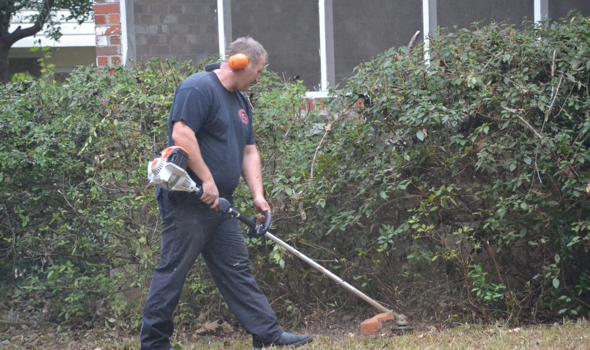 The five men did a complete overhaul of the back yard, cutting down several dead trees that endangered the house, ripped away vines hanging from the gutters, trimmed bushes, used the weed-eater, cleaned up sticks and other debris, all before finally cutting the grass.