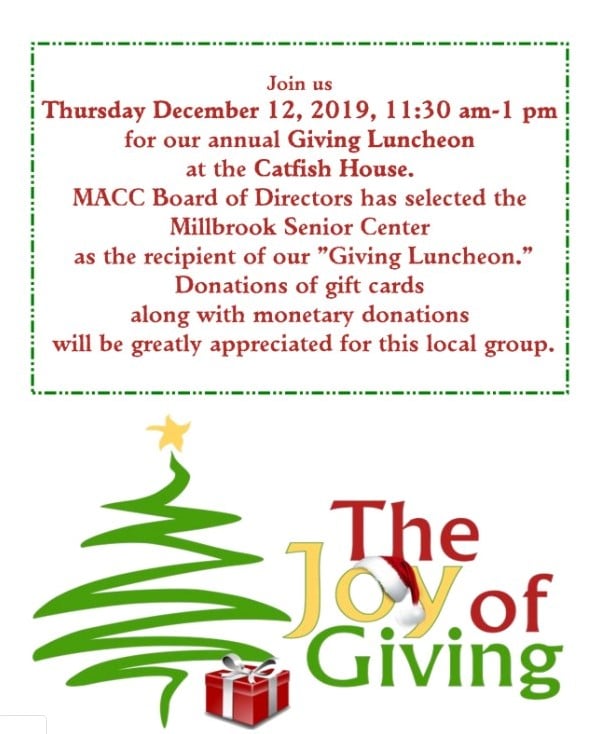 The Millbrook Chamber of Commerce is hosting a “Giving Luncheon” to benefit the Millbrook Senior Center Dec. 12 from 11:30 a.m. to 1 p.m. at the Catfish House in Millbrook.