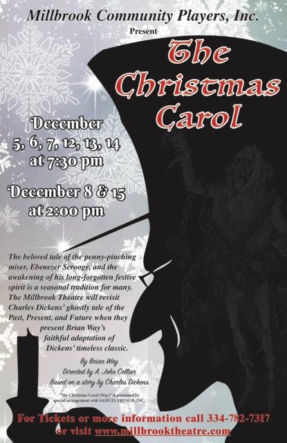 The Millbrook Community Players, Inc., will present “The Christmas Carol” Dec 5, 6, 7, 12, 13, 14 at 7:30 p.m. and Dec. 8 and 15 at 2 p.m. on their stage at the old Robinson Springs School on Main Street.
