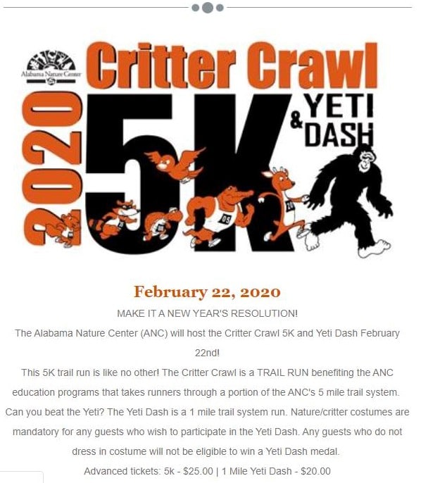 The Alabama Nature Center (ANC) will host the Critter Crawl 5K and Yeti Dash February 22nd! This 5K trail run is like no other! The Critter Crawl is a TRAIL RUN benefiting the ANC education programs that takes runners through a portion of the ANC’s 5-mile trail system.