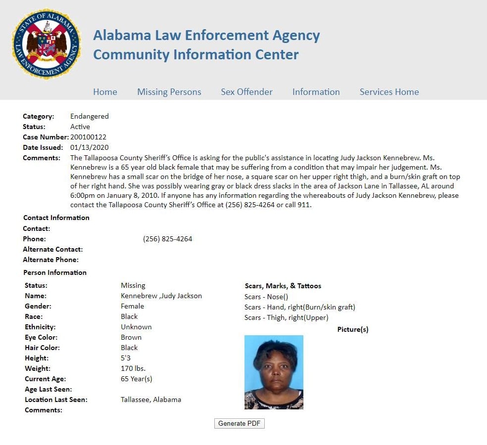The Tallapoosa County Sheriff’s Office is asking for the public’s assistance in locating Judy Jackson Kennebrew. Ms. Kennebrew is a 65-year-old female that may be suffering from a condition that may impair her judgement. She has a small scar on the bridge of her nose, a square scar on her upper right thigh and a burn/skin graft on top of her right hand. She was possibly wearing gray or black dress slacks in the area of Jackson Lane in Tallassee, AL around 6 p.m. Jan. 8. If anyone has Information regarding the whereabouts of Judy Jackson Kennebrew, please contact the Tallapoosa County Sheriff’s Office at (256) 825-4264 or call 911.