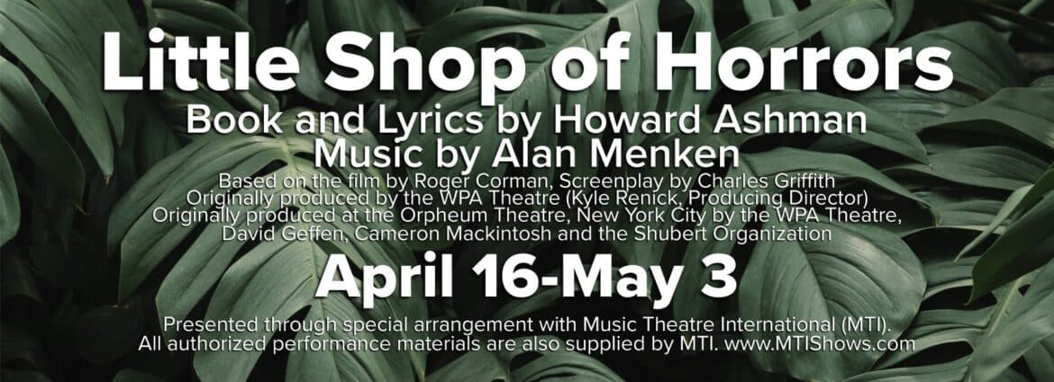 Little Shop of Horrors, book and lyrics by Howard Ashman and music by Alan Menken, is based on the film by Roger Corman, screenplay by Charles Griffith. It is presented through special arrangement with Music Theatre International (MTI). The production will open April 16, 2020, and run Fridays, Saturdays, and Sundays through May 3. Tickets for this musical will go on sale February 1st and will be $12 in advance and $14 at the door if available.
