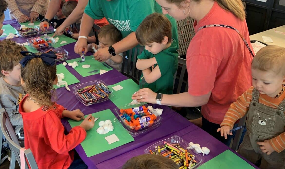 After reading the two books to the audience, Curry brought Chester back out of bag and let him show the kids what craft they would be doing that day. Chester showed his lovely artwork of colorful flowers and snow, which the kids then tried to mimic as they sat down at their crafting tables.