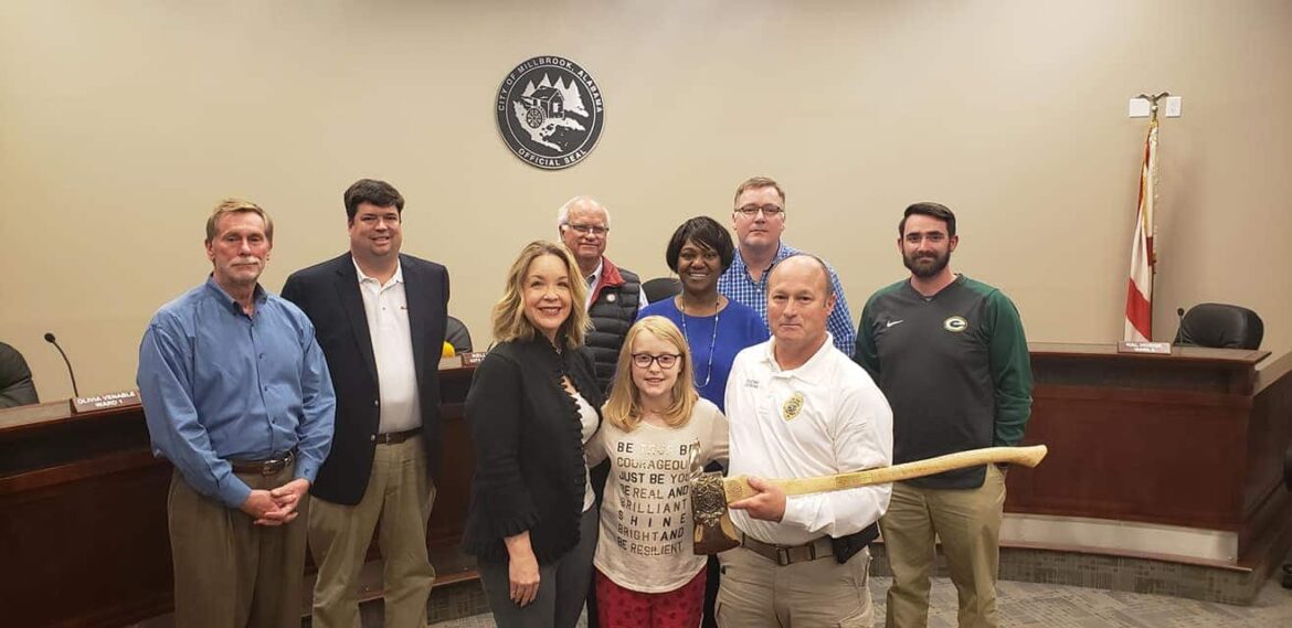 Millbrook Fire Chief Larry Brown and his firefighters/medics were honored at Tuesday night’s Millbrook City Council meeting by the Muscular Dystrophy Association with a Golden Axe Award for raising $10,000 in the MDA Fill the Boot event held each year.