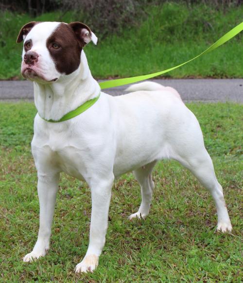 Raylee is a 2-year-old female American Bulldog mix who must be spayed before she is adopted. She came to PAHS as a stray and her owner never came looking for her. Raylee is a solidly built lady who weighs 50 pounds so she is considered to be a medium sized adult dog. She is a stunningly pretty girl who is almost completely white with chocolate markings on her head. Raylee is a friendly and sweet girl who would be fine in a home with children. We suggest if you have other dogs that you bring them in for a meet and greet with Raylee. She gets along well with most other dogs but might play too rough to be with smaller dogs. Raylee loves to be outside and would appreciate a nice fenced yard where she could safely play. She is leash trained and enjoys going out for a walk. Raylee is pretty frisky so she would need to have regular exercise. Come meet this great big beautiful girl! Raylee is a wonderful dog who will be a great addition to some lucky adopter’s family.