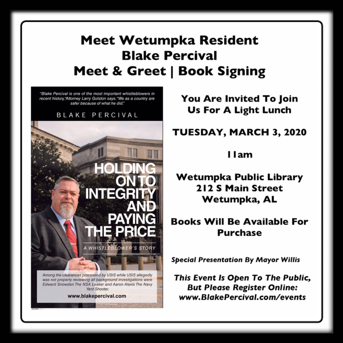 WEST POINT, GA – The former Director of Fieldwork Services for USIS and Wetumpka, Alabama resident Blake Percival, also known as the National Security Threat Whistleblower that significantly changed the manner in which background investigations are now conducted, will release his new tell all book, “Holding On To Integrity And Paying The Price – A Whistleblower’s Story” on March 2.