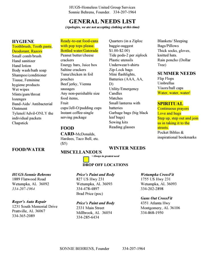 HUGS is a not for profit organization (currently applying for 501(c)3) that provides toiletries, snacks and water to the homeless and those less fortunate in the Montgomery, AL tri-county area. Service lines include Prisca’s Purses which are donated purse filled with day to day hygiene necessities for women. Purses are donated by local women and organizations. Rex’s Love is our men’s service line that again, providing daily necessities that are packed into donated draw string back packs. We are always in need of donated toiletries and love to receive hotel/sample size products.
