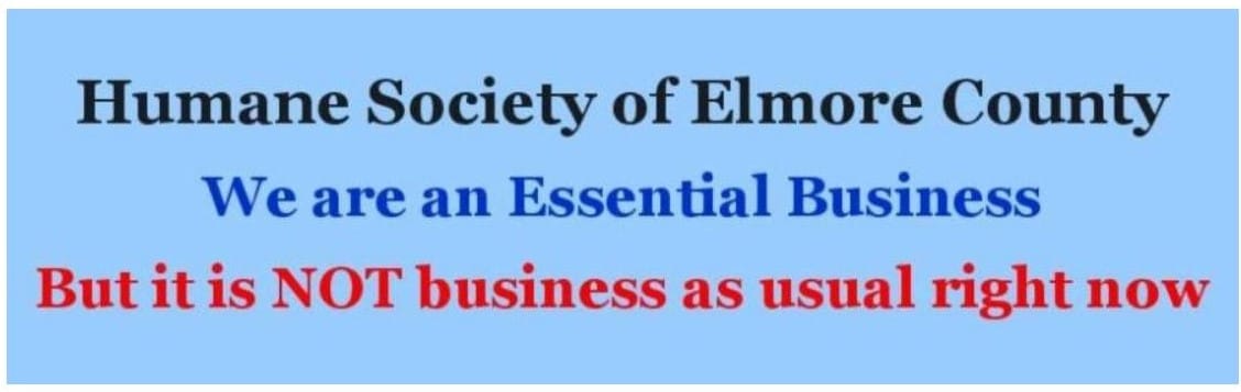 The Humane Society of Elmore County is considered an Essential Business during the COVID-19 Shelter in Place order through 30 April. We are essential as an agency to be there for emergency situations concerning domestic animals that require sheltering. But we have made significant changes to our operational procedures so that our staff can remain safe, so that we are not overloaded with animals that have no place to go, and so that we can do our part to reduce human movement at this challenging time.