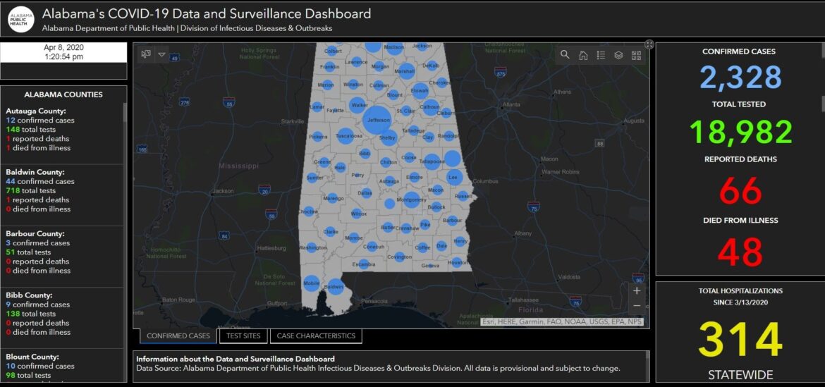 As of 1:30 p.m., the Alabama Department of Public Health is reporting 2,328 confirmed COVID-19 cases across the state. A total of 18,982 have been tested. Sixty-six deaths are reported, with 48 of those confirmed as COVID-19 related. They are reporting 314 hospitalizations since March 13, 2020 in Alabama.