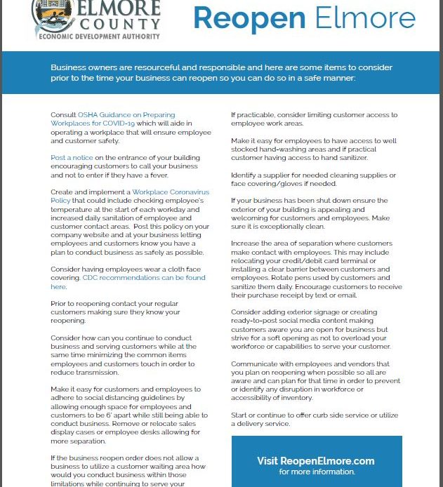 During the time leading up to you being able to reopen, ECEDA is encouraging our businesses to be prepared to protect their employees and customers when that time comes. “Our business owners are responsible citizens and stand ready to take the necessary steps to safely reopen,” stated Art Faulkner, Chairman of ECEDA. We have created a website that will help businesses have all the information they need , in one place, to safely and successfully navigate the path to reopening their business and restarting our economy. This restart will also lead to renewing of our motto, “Elmore County where Business Meets Pleasure.”