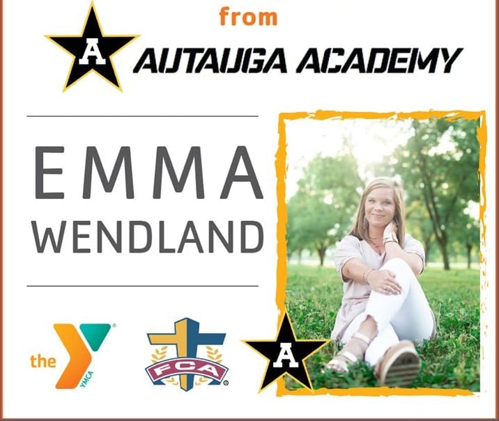 Emma Wendland is the kicker for Autauga Academy’s football team and played soccer for several years. She had a 4.05 GPA and is a leader in her school, church, team, and family. She is actively involved in Church Street United Methodist Church.
