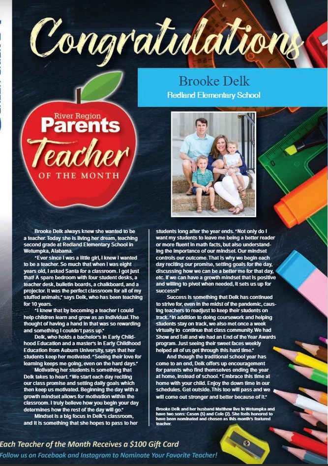 Congratulations to Delk Brooke a RES Teacher, named River Region Teacher of the Month for June.