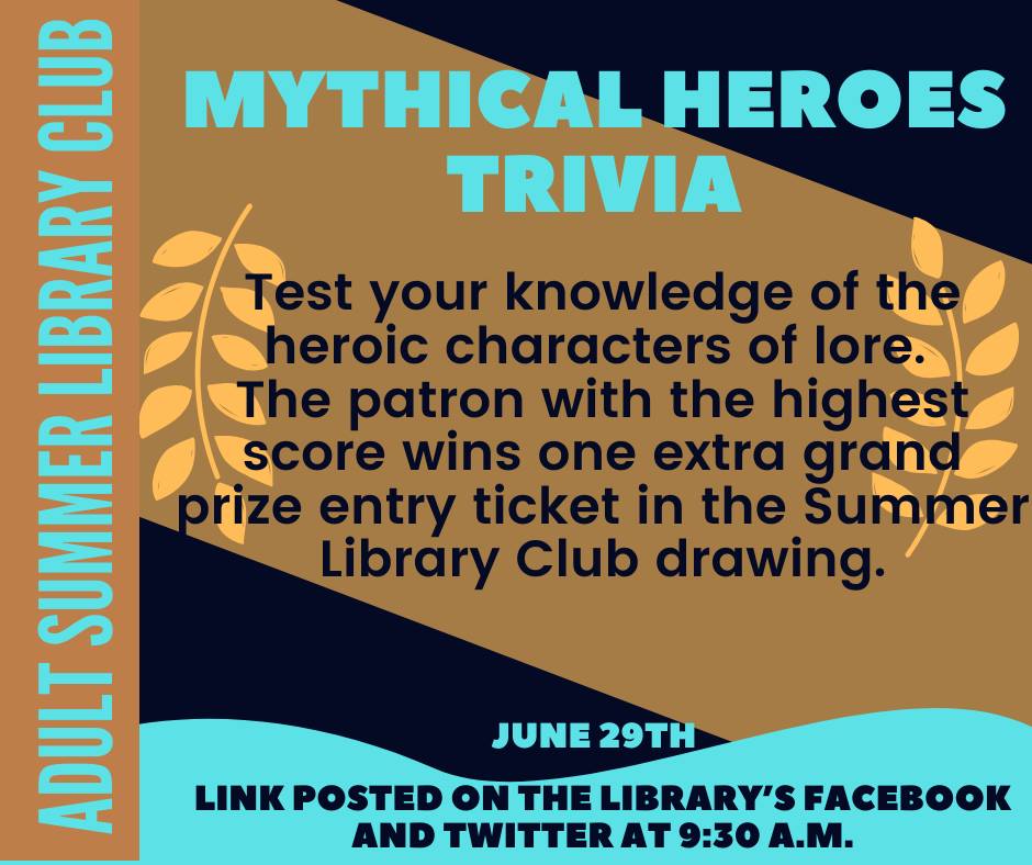 Test your knowledge of the heroic characters of lore. Link posted on the library’s Facebook and Twitter at 9:30 a.m. The patron with the highest score wins one extra grand prize entry ticket in the Summer Library Club Drawing.