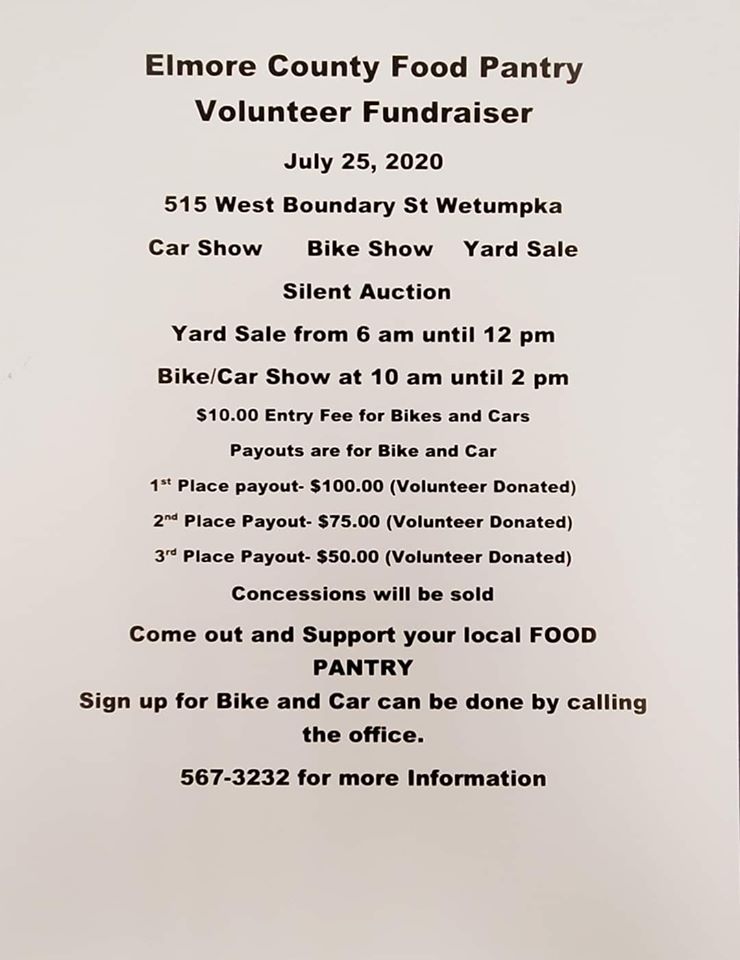 The fundraiser will be July 25 at 515 West Boundary Street in Wetumpka. It includes a Car Show, Bike Show, Yard Sale and Silent Auction.