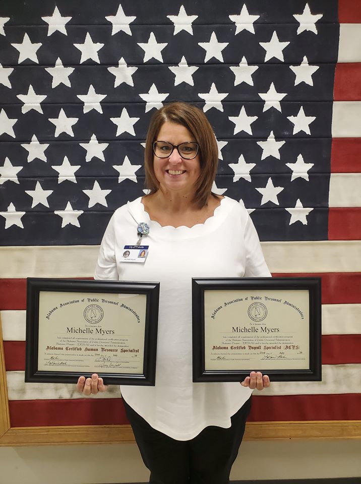 The Alabama Public Personnel Administrators Association (AAPPA) and the Government and Economic Development Institute at Auburn University are delighted to announce that Michelle Myers, Fire Personnel/Admin Coordinator for the Prattville Fire Department has met all requirements to be designated an Alabama Certified Human Resource Specialist. Michelle joins a list of only 56 Alabama human resource officers throughout the state with this distinction.