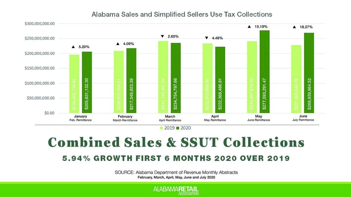 In the first six months of 2020, taxes remitted by sellers located in and outside Alabama grew by almost 6% compared with the same time last year.