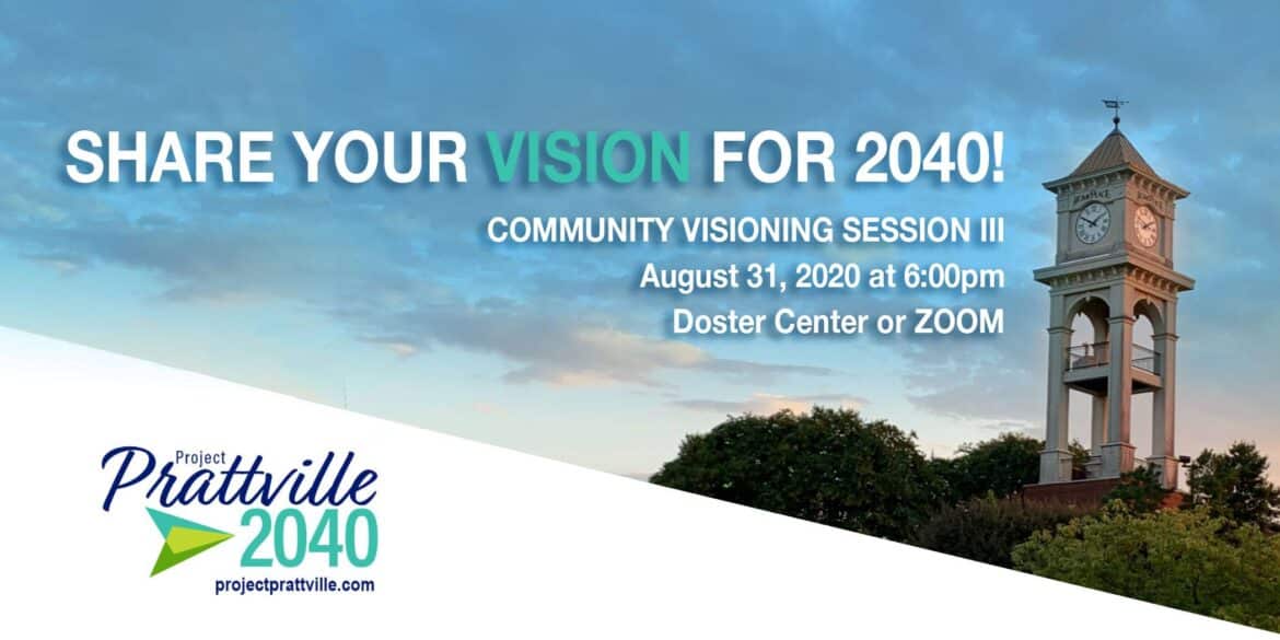Mark your calendars for the third Community Visioning Session for Project Prattville 2040 on Monday, August 31st, at 6:00 pm at the Doster Center or virtually through ZOOM. Our consultant team, KPS Group, will be giving status and summary updates, as well as discussing the wants and needs within our community. Learn more about Project Prattville 2040 by visiting