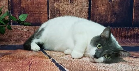 Knox is a handsome 2-3 year-old white and gray male cat who came to us way back in Dec ’19 with some serious skin issues that have all been resolved. He is a super sweet boy, very loving, good with other cats – must be an indoor only kitty. Also it is very important that he be kept on Bravecto flea treatment every three months, AND eat a GRAIN FREE food to make sure his skin and coat stay healthy.