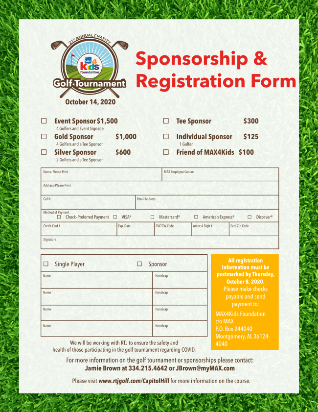 All registration information must be postmarked by Thursday, Oct. 8, 2020. Please make checks payable and send payment to MAX4Kids Foundation C/O MAX