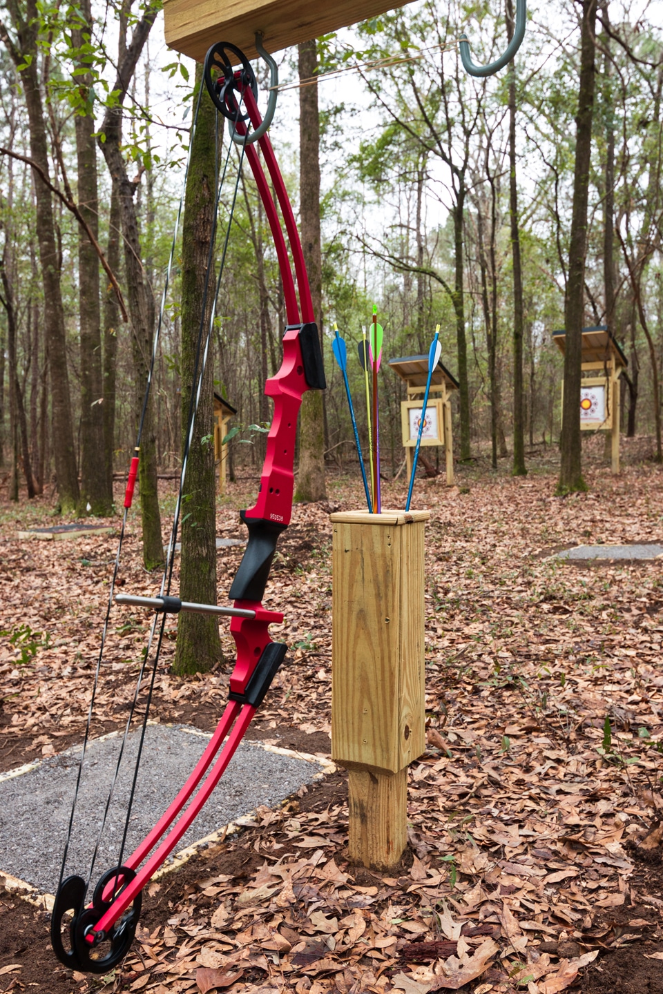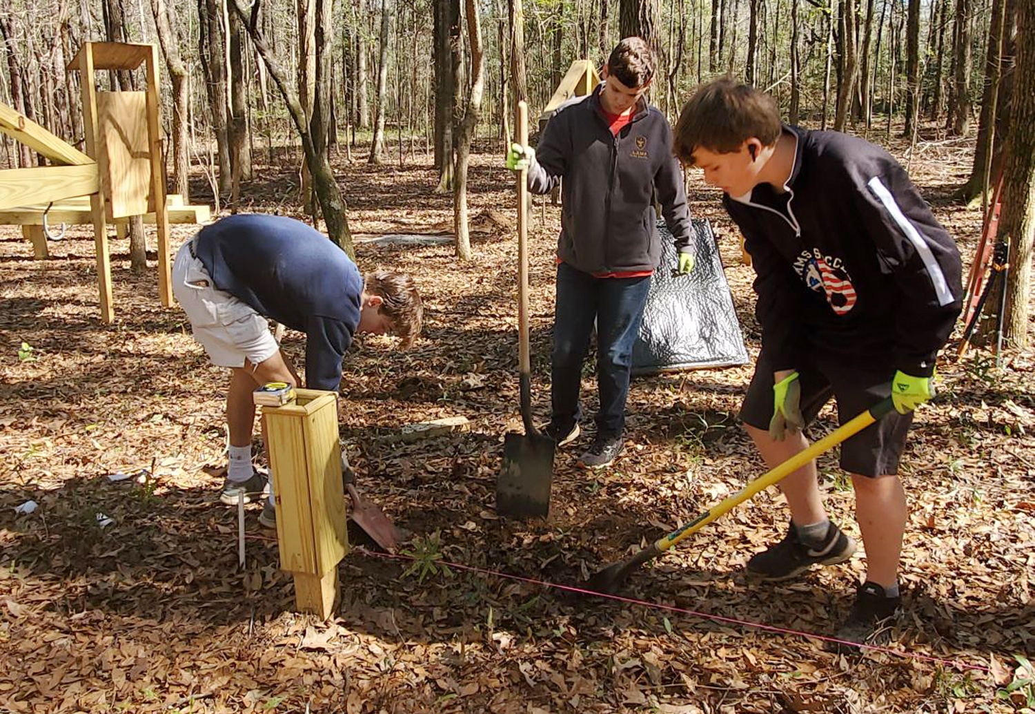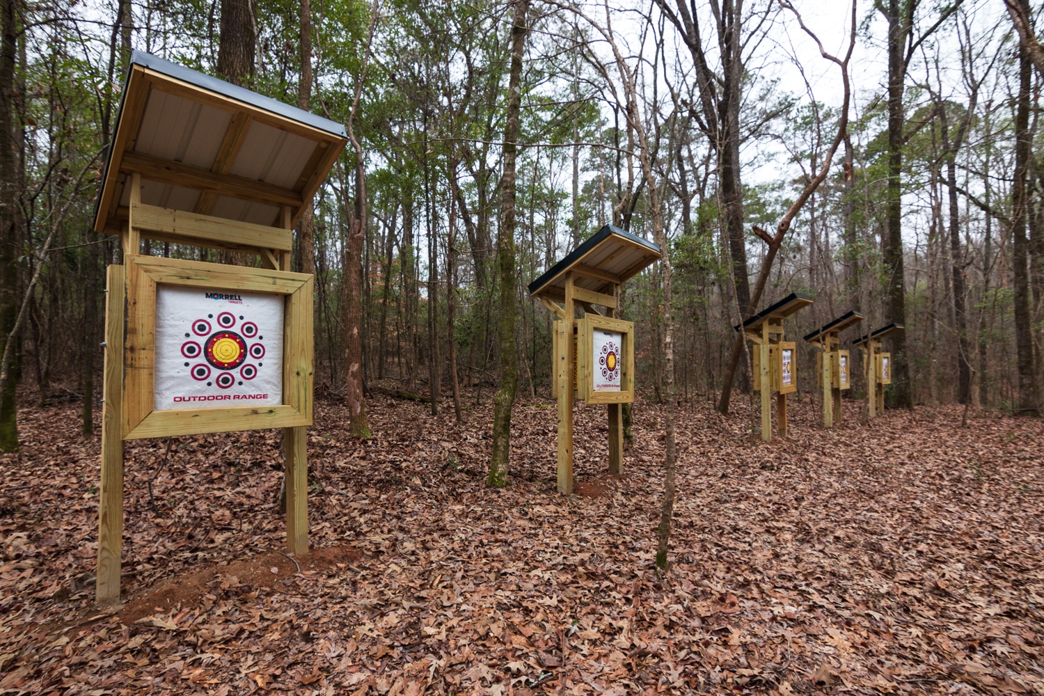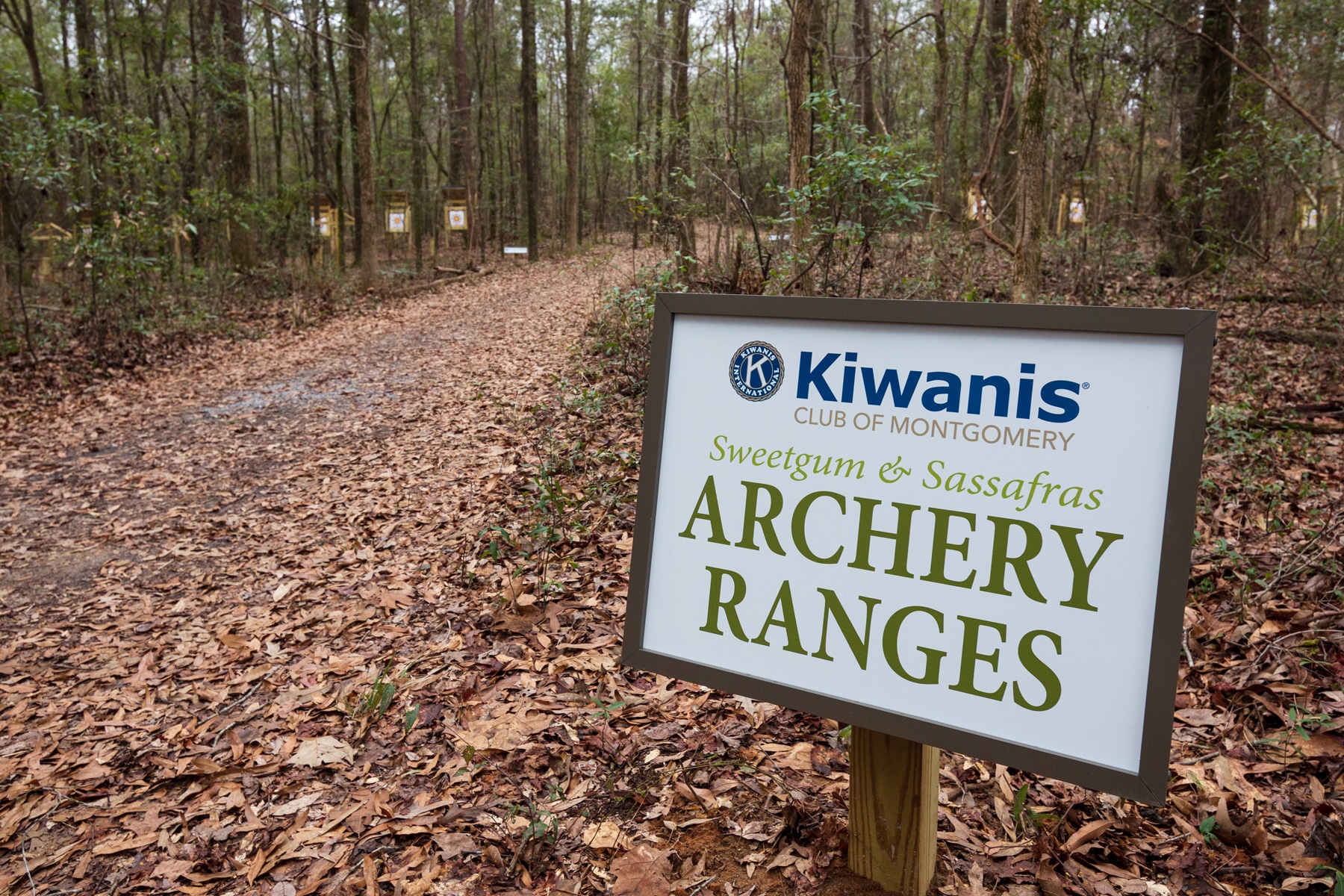 In addition to providing the necessary funds to anchor the project, The Kiwanis Club of Montgomery grant also served as a catalyst to inspire significant volunteer investments to bring the project to reality. Over the fall and winter, volunteer trainees from Maxwell Air Force Base Officer Training School led the selective hand-clearing and removal of natural debris, vegetation, and saplings from the two forested sites. In November, the wooden targets, bow holders, quivers, and seating areas were professionally constructed. During the same time period, two Eagle Scouts, Nickolas Schmidt of Troop 307, and Ethan Taylor of Troop 15, both of Montgomery, AL, took on the job of finishing the ranges. They constructed shooting pads, education kiosks, moveable platforms, and cleared additional natural debris. Together, the Eagle Scouts, their families, and members of their troop provided the impressive final touches.