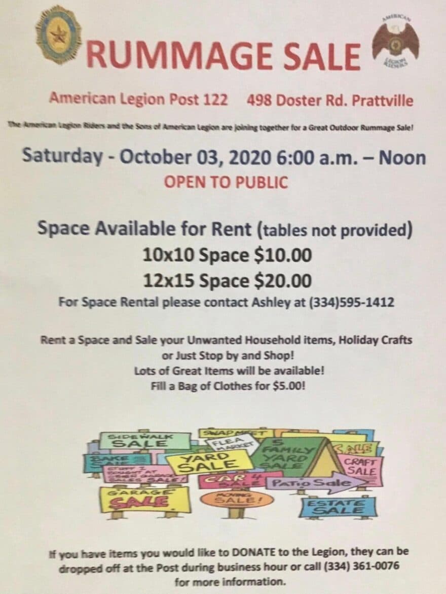 American Legion Post 122 of Prattville will host an Outdoor Rummage Sale Oct. 3 at the Post to raise funds for their Prattville Community Christmas Project.