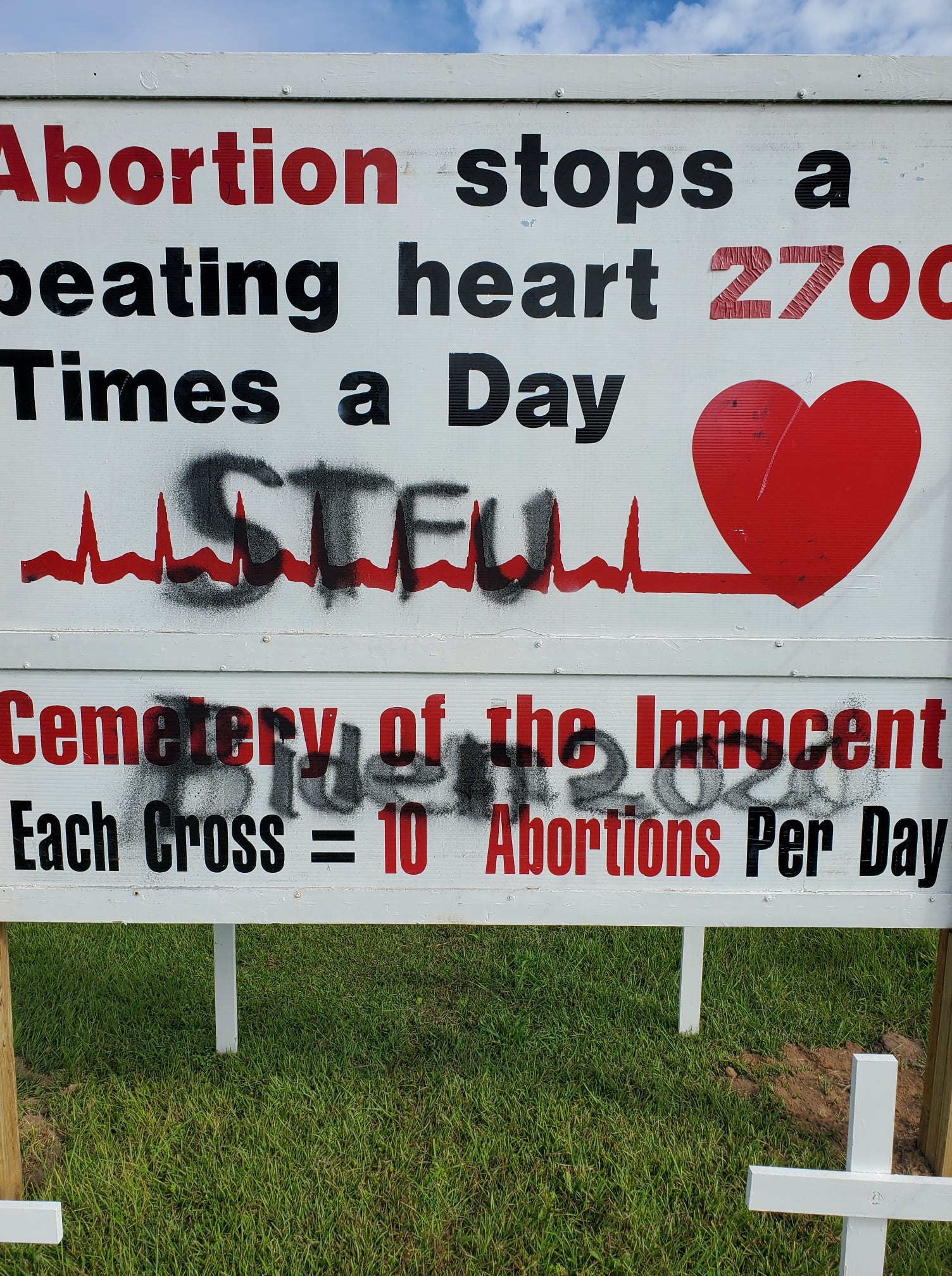 The church had placed A “Cemetery of the Innocent” with white crosses and billboards on church property. This morning it was discovered someone had spray painted the billboards with “Kill All Babies 2020” and “STFU Biden 2020.”