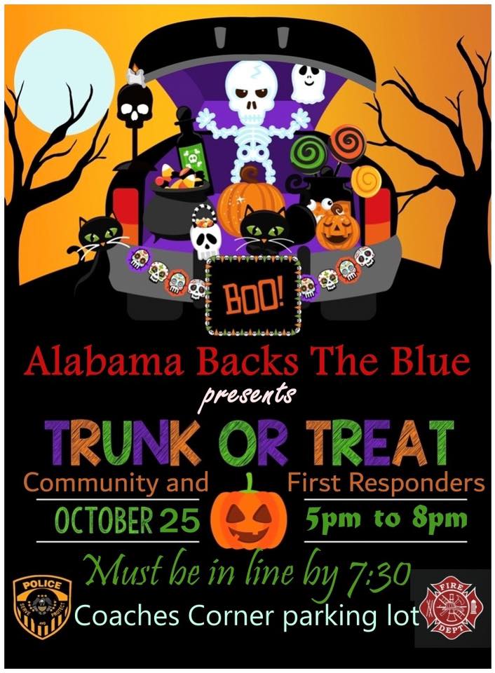 The Alabama Backs The Blue organization of Wetumpka will host a Trunk or Treat event with First Responders at Coaches Corner. They are asking for participants to sign up.