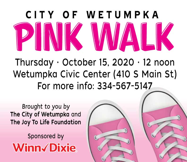 The City of Wetumpka is joining forces with the Joy To Life Foundation for a “Pink Walk” Thursday, Oct. 15 beginning at Noon.