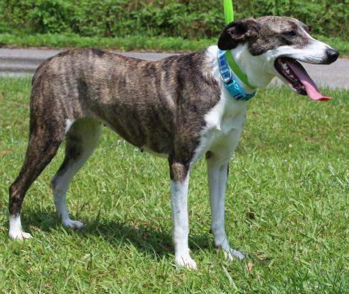 Maggie is a 2-and-1/2-year old female Greyhound mix who has been spayed.  She came to PAHS as an owner turn because she will not stay in the fenced yard.  Maggie is a pretty girl whose short coat is brindle with white markings.  She currently weighs 36 pounds so she is considered to be a medium sized dog.  This is a sweetheart of a dog!  She is super affectionate and really just wanted to be loved on and cuddled when we made her pictures.  Maggie is very playful and lively so she would enjoy life best with an active family who would be sure to include her on all their outdoor adventures!  She is already leash trained, house trained, and would love going on nice walks with her new owner.  We believe Maggie would be great in a home with other dogs and children.  We would not recommend she be in a home with cats. Maggie appears to be an intelligent gal; and with her quiet, and gentle character she is sure to make an excellent family dog!  Come check this little darling out soon!