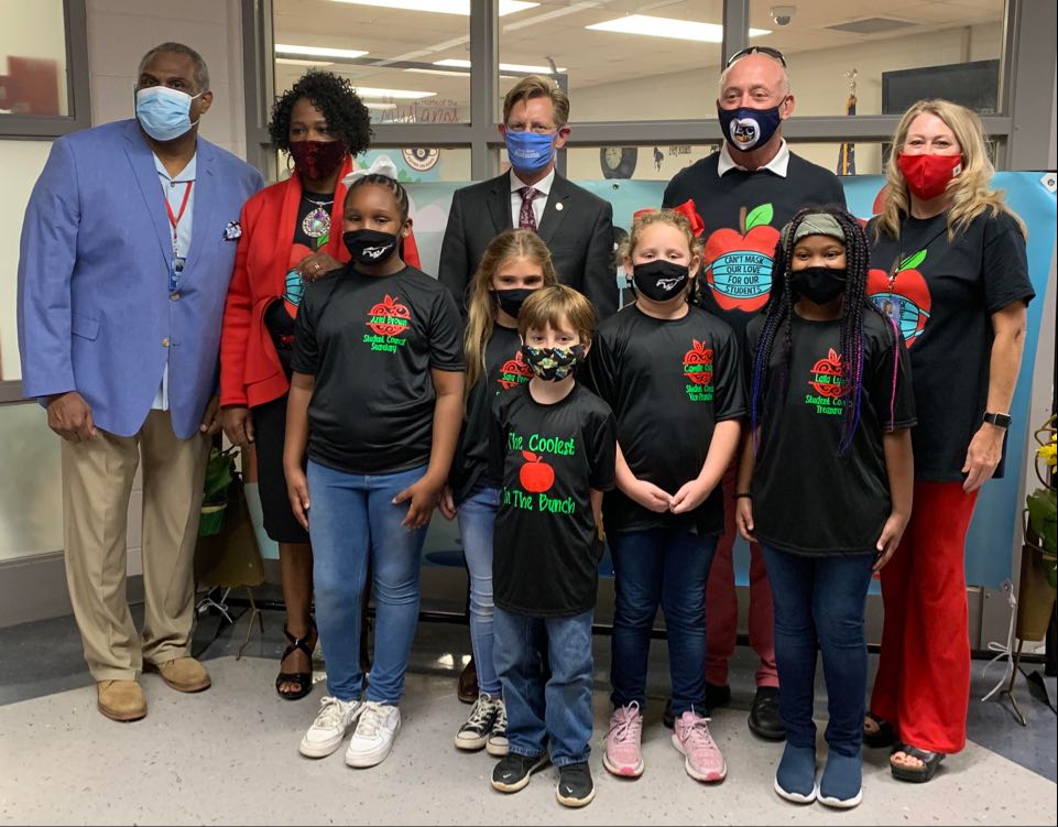 Students at Airport Road Intermediate School had a special visit from state and local officials Wednesday! The State Superintendent Dr. Mackey visited the school for Apple Crunch Day! Pictured with Dr. Mackey are student council officers, Richard Dennis, Mr. Saxon, Mrs. Stephens and Mrs. Earl. (Photo from ARIS)