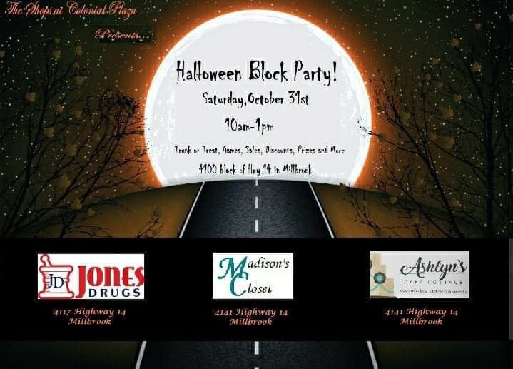 Three Millbrook businesses are joining together on Halloween for a Block Party! Saturday, Oct. 31 head to the 4100 block of Hwy. 14 in Millbrook from 10 a.m. to 1 p.m. Businesses include Jones Drugs located, Madison’s Closet and Ashlyn’s Cake Cottage. Employees will be hosting a Trunk or Treat, Games, Sales, Discounts, Prizes and much more!