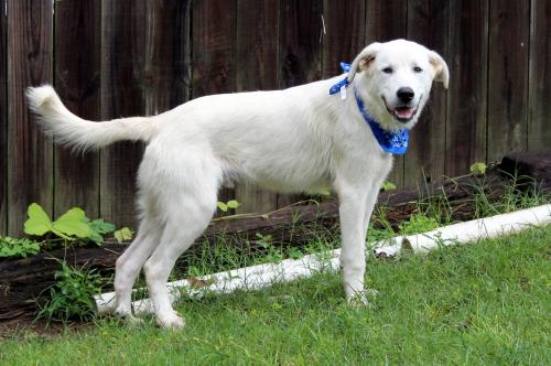 Thomas looks to be possible Great Pyrenees/Labrador mix, about two-years old, and is a very tall 60-pound fella. He came to us as a stray who was a bit independent at first but he has proven to be a very friendly boy, good with other dogs and cats, and pretty laid back. Now we have seen test our fence quite a bit so his new home will need a very good and tall fence to keep him safely at home.