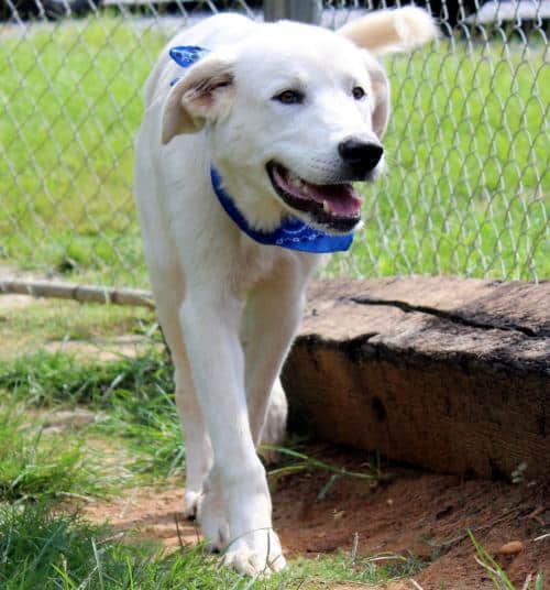 Thomas looks to be possible Great Pyrenees/Labrador mix, about two-years old, and is a very tall 60-pound fella. He came to us as a stray who was a bit independent at first but he has proven to be a very friendly boy, good with other dogs and cats, and pretty laid back. Now we have seen test our fence quite a bit so his new home will need a very good and tall fence to keep him safely at home.