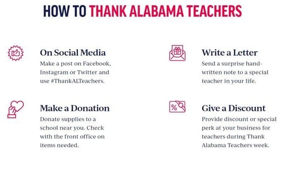 As part of Thank Alabama Teachers week, businesses, individuals and influencers will be encouraged to show gratitude by offering teacher discounts, posting thanks via organizational and personal social media accounts using #ThankALTeachers, writing favorite teachers a thank you letter, gifting teachers a small sign of appreciation, or donating essential items to local schools. Additionally, Thank Alabama Teachers messages will be visible via multiple forms of advertising and through a dedicated initiative landing page.