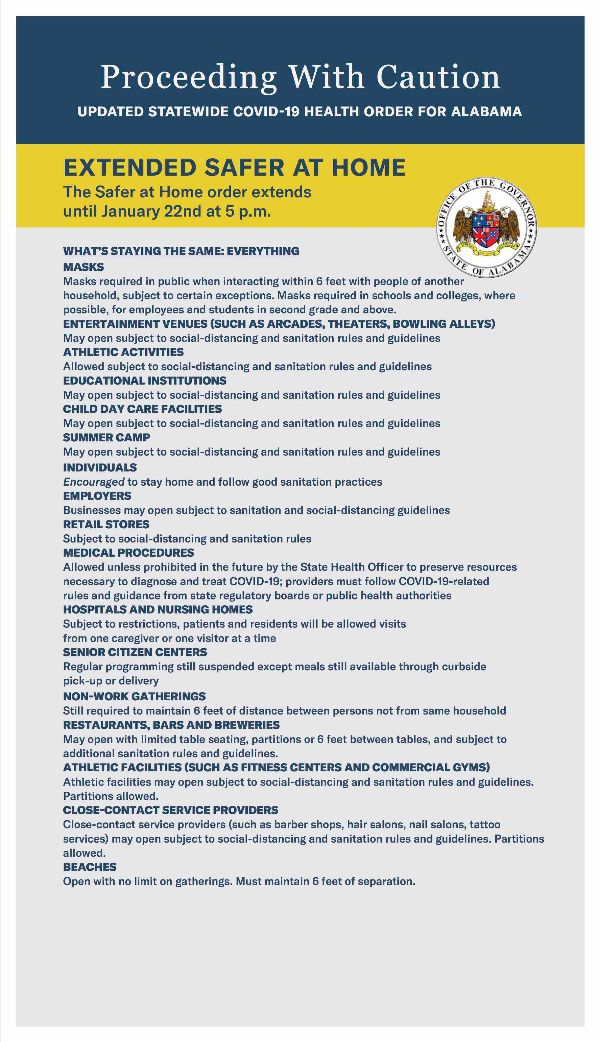 Gov. Ivey held a press conference this morning where she announced she would be extending the mask ordinance and other COVID-19 restrictions until January 22, 2021, at 5:00 pm.
