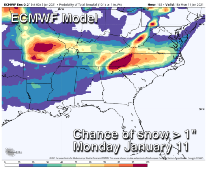 SNOW? You will see snow maps plastered all over social media (mostly from people who don’t have a fundamental idea of how numerical weather prediction actually works) about the system that will impact Alabama Sunday night into Monday. Looking at deterministic model output for a system this far out really isn’t productive; it is best to use ensemble model output and probabilistic forecasts.