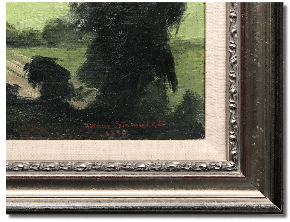In addition to its large size and condition, part of our excitement about this particular painting is its date, which was one of the years Stewart attended the Dixie art Colony. Although we cannot confirm this scene’s exact location, we have compelling evidence that suggests it is a Central Alabama scene. During colony sessions, the colony artists made regular day trips throughout Elmore, Tallapoosa, Coosa, Autauga, and Chilton Counties to paint the local landscape.
