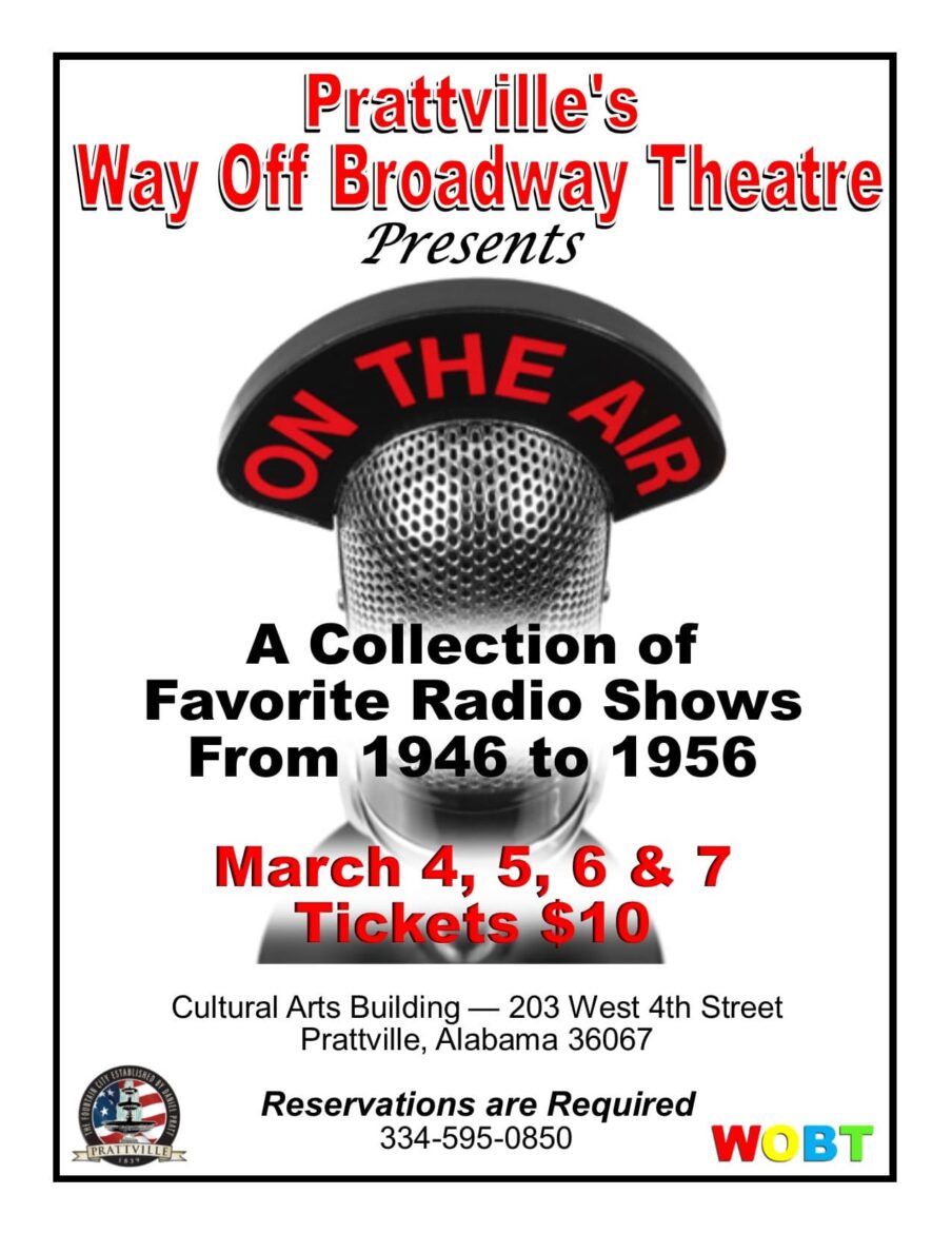 Prattville’s Way Off Broadway Theatre is excited to announce its production of On the Air, a collection of old-time favorite radio shows from 1946 to 1956.