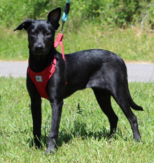 Zoe is a 5-month-old female Black Lab mix. She came to PAHS as an owner turn in because the other dog in her family was not doing well with Zoe. Zoe is black with white markings; doesn’t she look adorable with her red harness? We love the one ear up–one ear down look! We think it gives Zoe character–not that she needs any because she is a character! She weighs 30 pounds and will be a medium sized adult dog. Zoe is smart! She is already both leash trained and house trained according to her previous owner. Zoe prances like a show pony when walking on a leash! Her owner shared she has been an indoor dog and prefers being inside. Zoe is absolutely great with children and other dogs. This is such a nice dog who deserves a new loving family and a totally awesome home! Please consider making Zoe your new best friend!