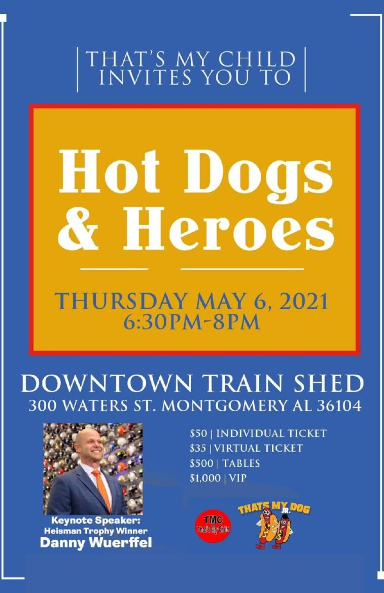 MONTGOMERY – THURSDAY, MAY 6, 2021 AT 6:30PM That’s My Child will host Hot Dogs and Heroes Fundraiser featuring Heisman Trophy Winner Danny Wuerfell. This event supports the programs that mentor the youth through arts, education and workforce development. Join us as we honor our community heroes and present two scholarships! All you can eat from local restaurants across the River Region with Live Music, Free Food, Free Drinks! For more information, please visit: https://hotdogsandheroes.swell.gives/