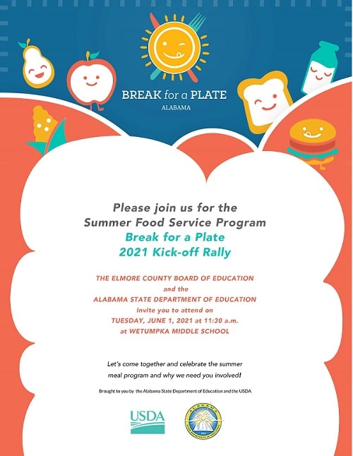 However, the Elmore County Board of Education, the Alabama State Department of Education and the USDA will kick off their food program June 1 at 11:30 a.m. at Wetumpka Middle School. Come out and learn more about the program and how you can get involved to help your neighbors by volunteering.