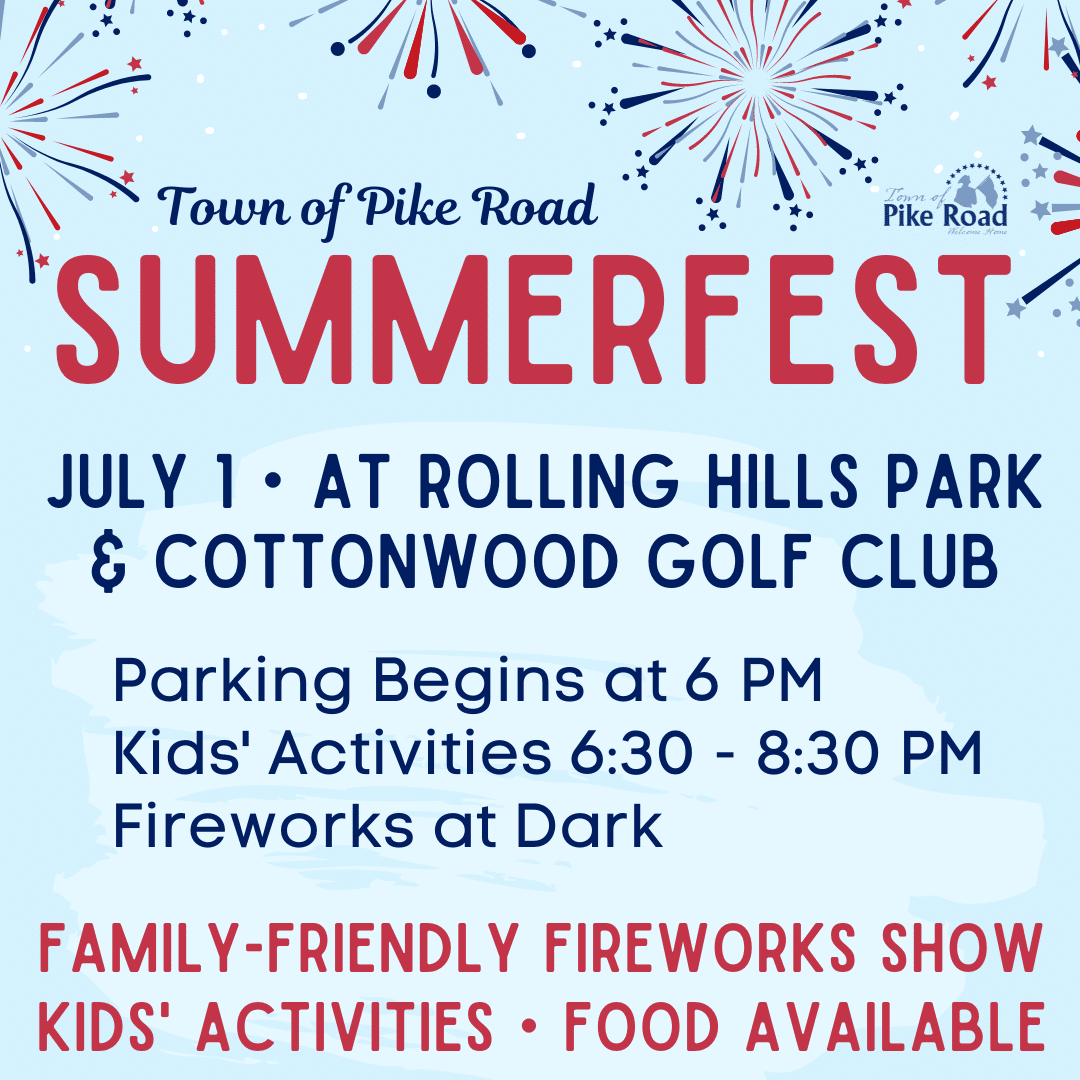 PIKE ROAD, Ala – Grab your lawn chairs and picnic blankets, and put on your favorite reds, whites and blues: The Town of Pike Road’s annual SummerFest celebration is just around the corner. The Town is pleased to invite the community to join us for SummerFest, a family-friendly fireworks show on July 1 at Rolling Hills Park and Cottonwood Golf Club, off Trotman Road. Patriotic spirit runs deep in the Pike Road community, and it is always special to celebrate the Fourth of July together.