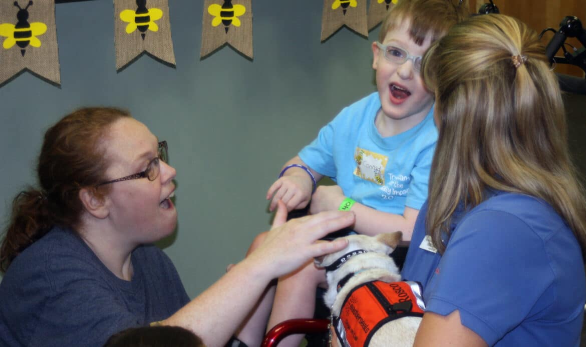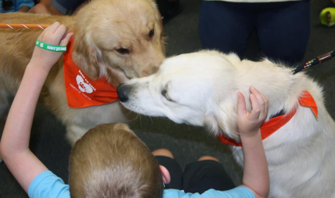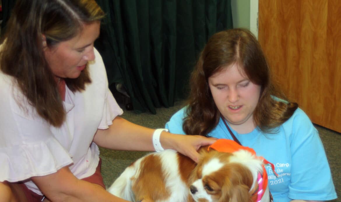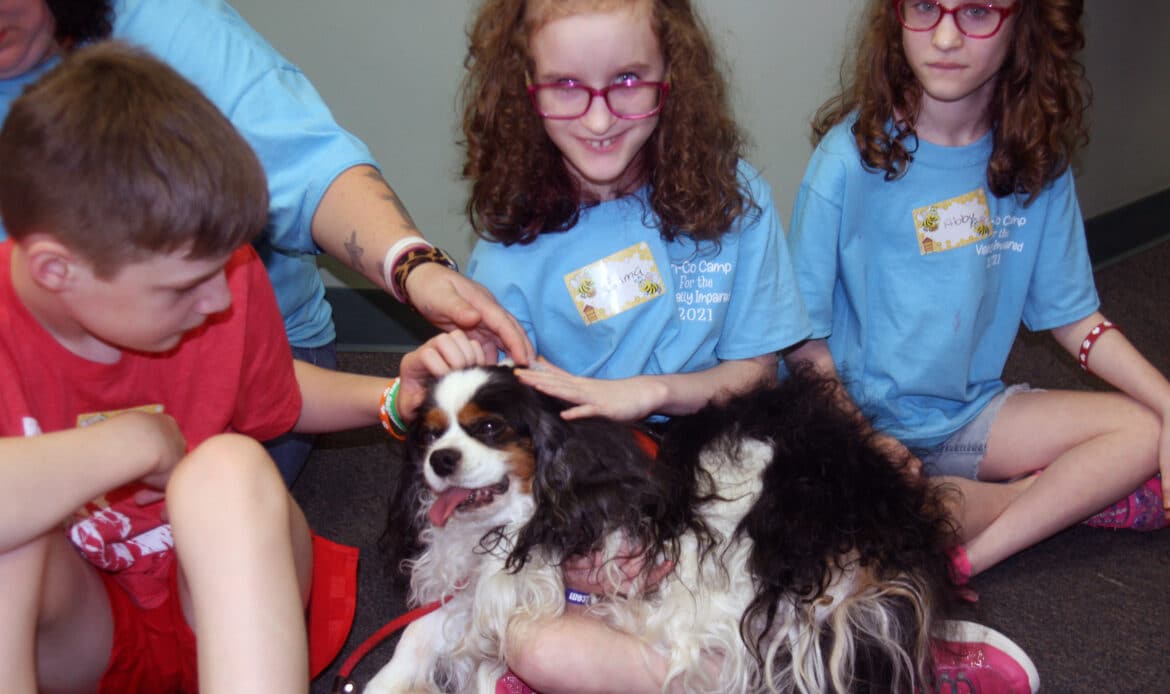 Children were petting and snuggling doggies of many sizes and breeds Tuesday when “Dogs on Call” brought seven therapy dogs to the second day of the Tri-County Camp for the Visually Impaired.