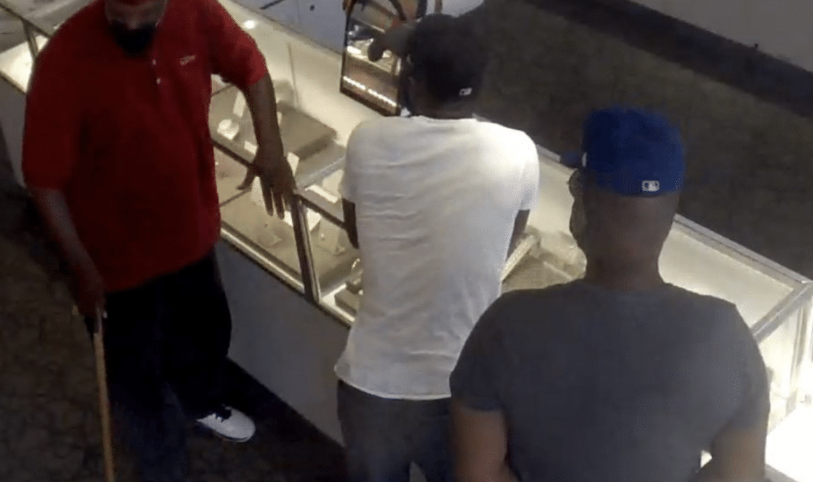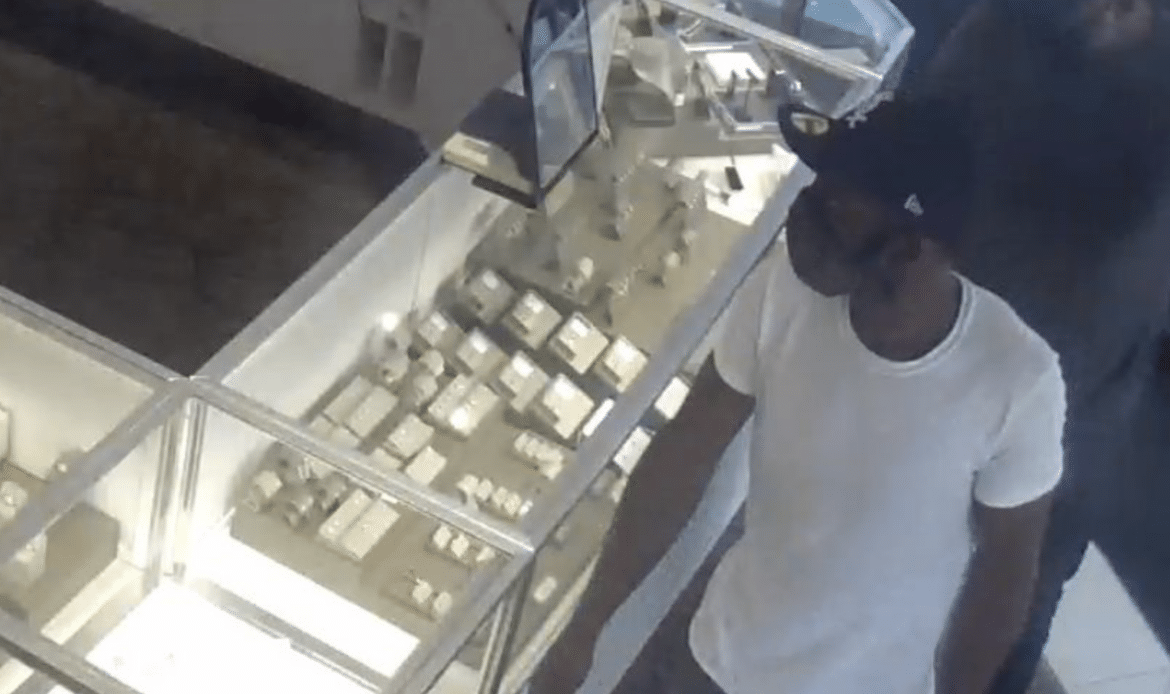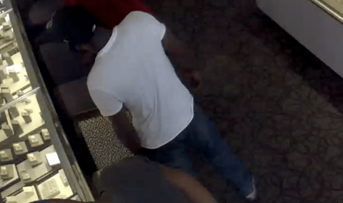 On 06/01/2021 three unknown males entered a jewelry store. The three males kept redirecting the salesclerk to pull jewelry from the display cases. The other associates observed what was going on and proceeded to assist the salesclerk. The male in the white t-shirt and black ball cap reaches into the display case taking a necklace. He then turns and walks out the door. The other two males soon follow.