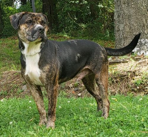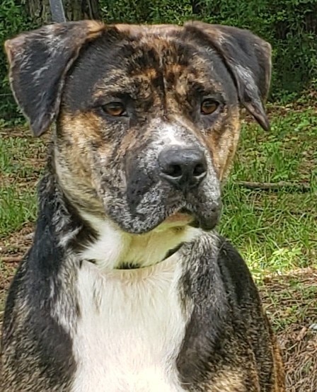 Curtis looks to be a male Bulldog/Catahoula mix, about two-years old, & 60 lbs. He was a stray that showed up at a family’s home and he could have stayed but was stealing all the neighbor’s packages. He is a very loving dog, wants to be a big lap dog, but he is also a LOT of dog and will take you skiing on a leash if you are not prepared. He is quite striking in appearance, good with dogs, but not good with cats. We have treated him for heartworms and he says time to find his forever home!
