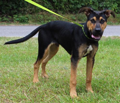 Damon is an 1-year-old male Shepherd? Doberman mix who must be neutered before he is adopted. This handsome boy was brought in as a stray and his owner never came looking for him. Damon has a gorgeous shiny black and tan coat. He currently weighs 37 pounds and we believe he will be a medium sized adult dog who will weigh no more than 60 pounds. He is a great big bouncing bundle of energy! Damon is super active and playful.