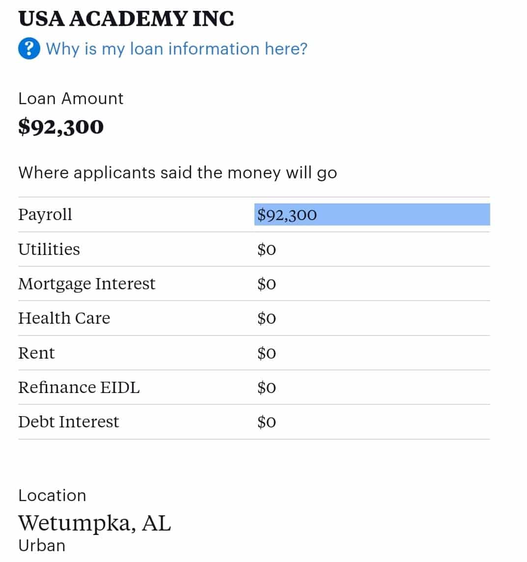 On the official website that lists payouts across the country, in Alabama USA Academy received $92,300, with the use of the money being stated as payroll. That link can be found at https://data.clarionledger.com/paycheck-protection-program-loans/?state=Alabama&searchtext=USA+Academy
